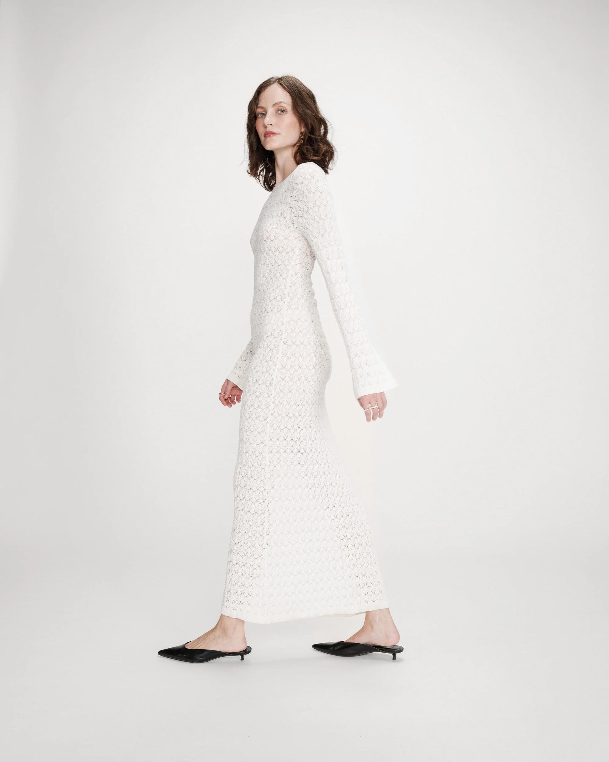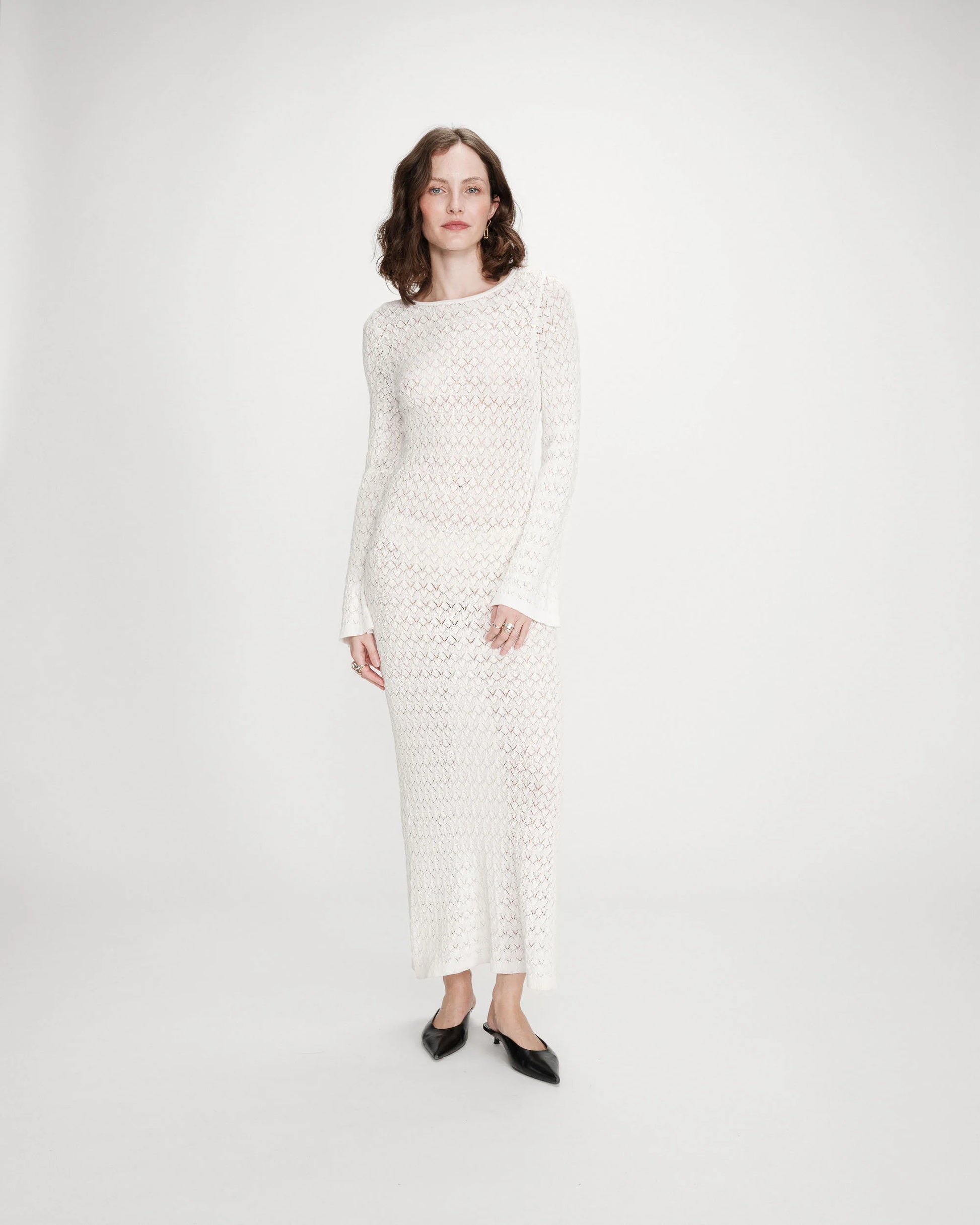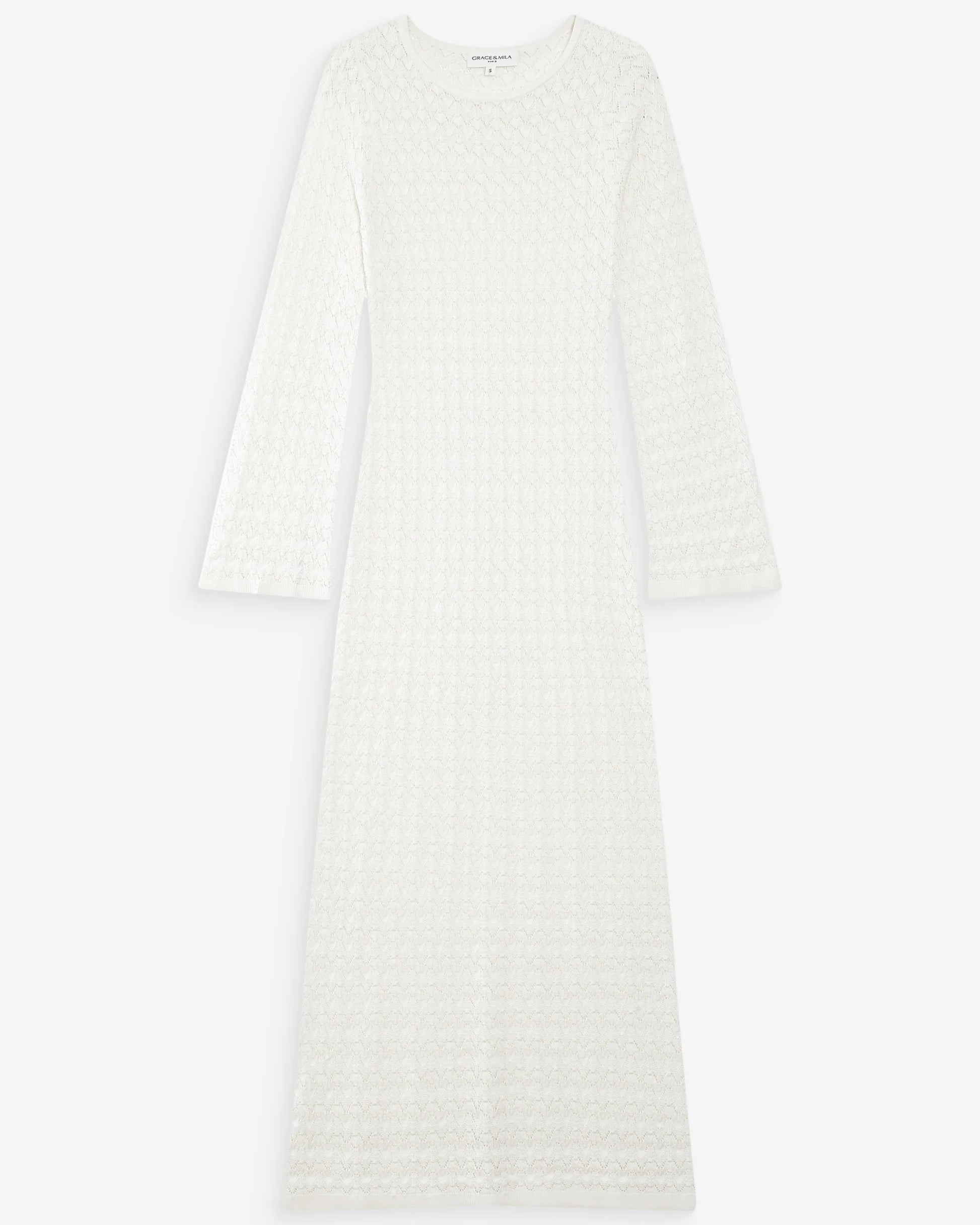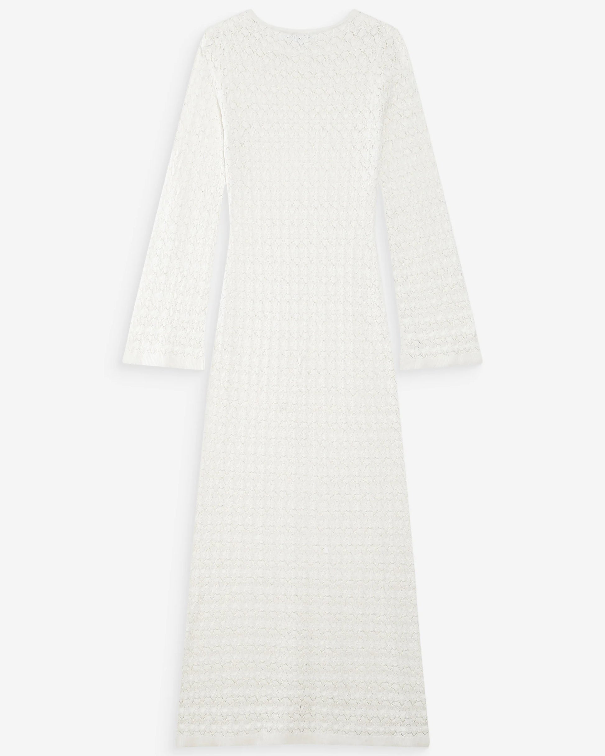 langes Kleid aus feinem Lochstrick - figurbetonter Schnitt - herausnehmbares Futter - lange, ausgestellte Ärmel mit Rippstrickbündchen - Rundhalsausschnitt
