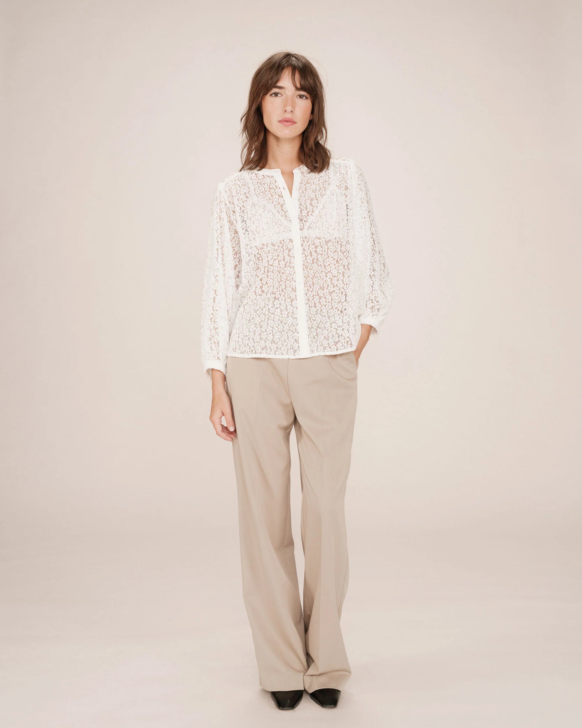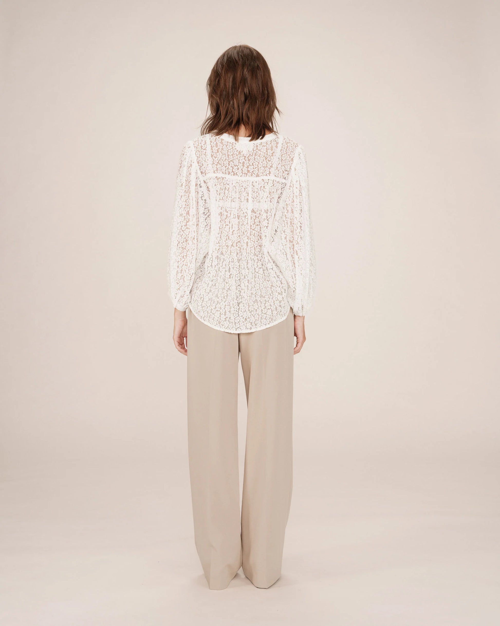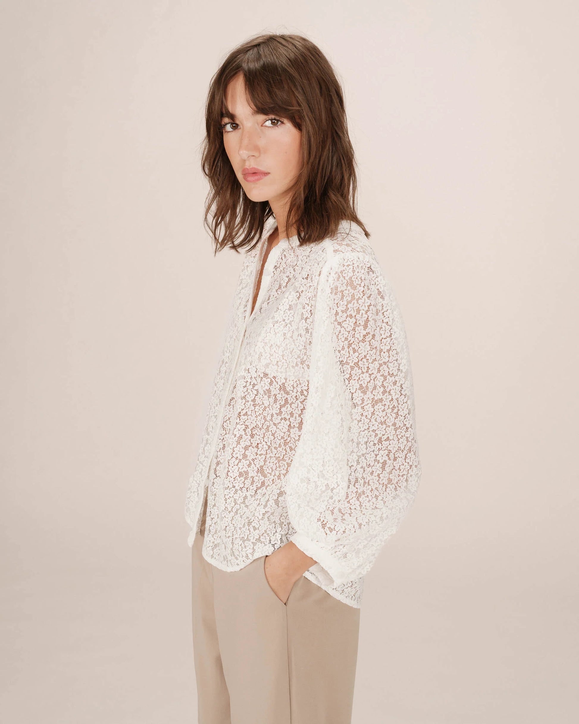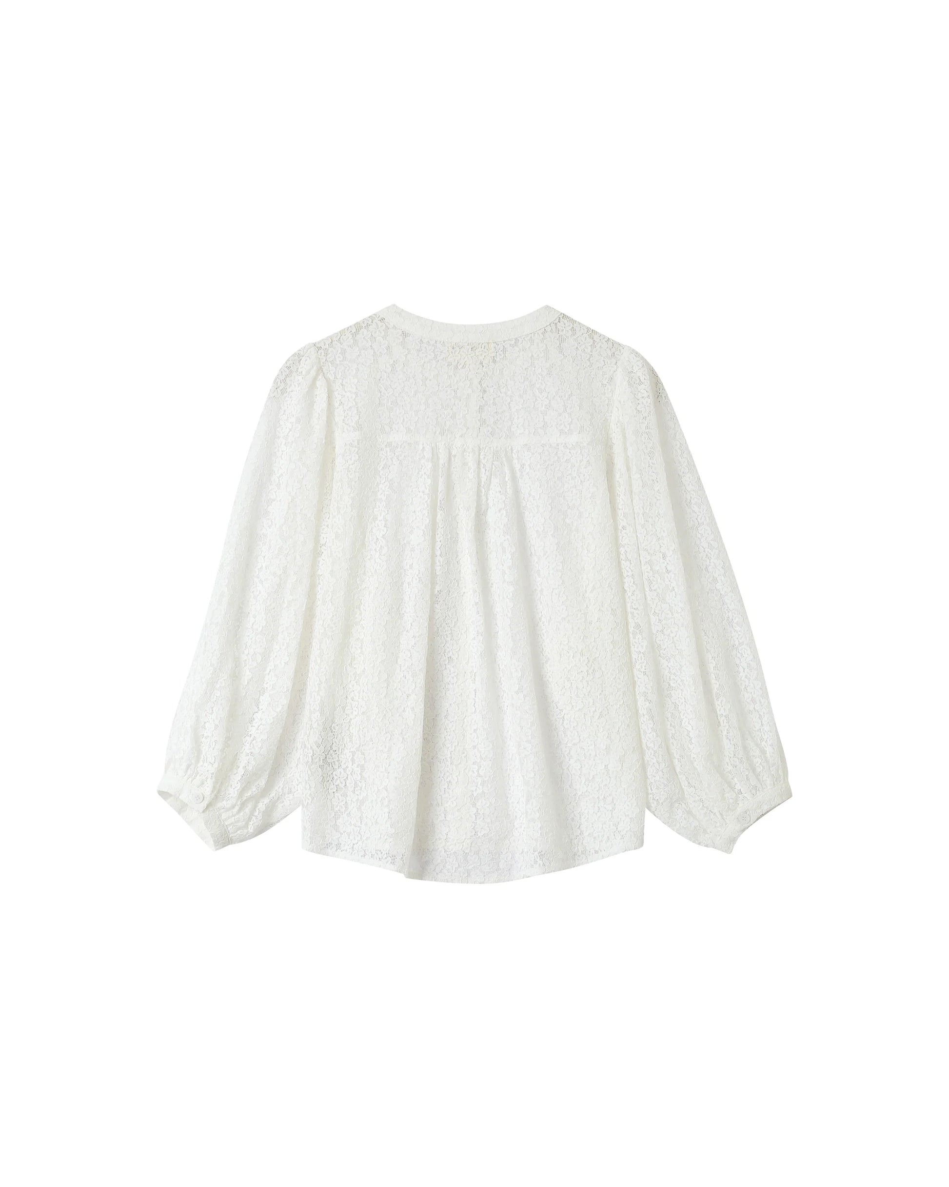 Spitzenbluse - lockere Passform - lange Ärmel mit geknöpften Manschetten - Rundhalsausschnitt - Knopfleiste vorne - geraffte Details an Schultern, Manschetten und Rückenpasse