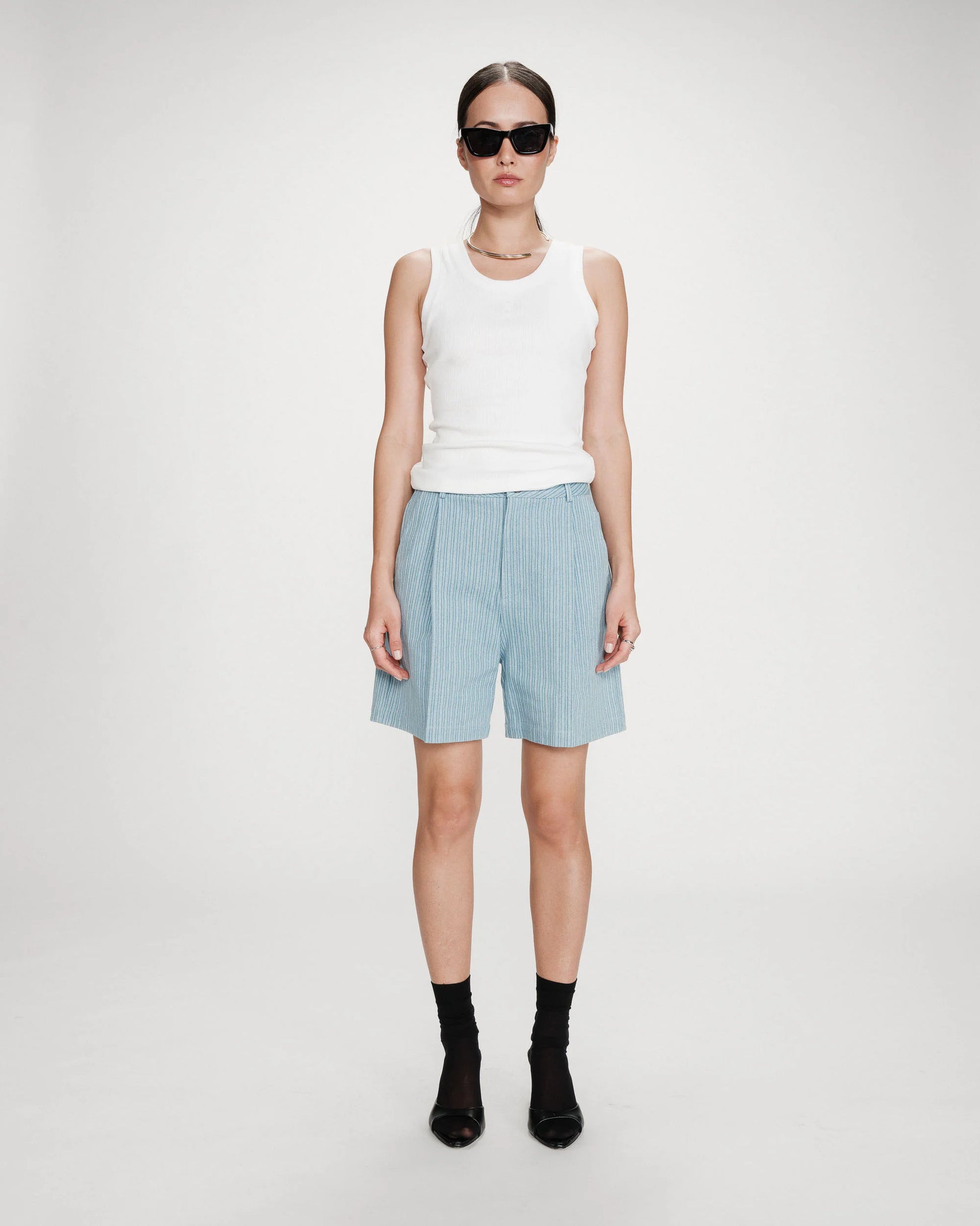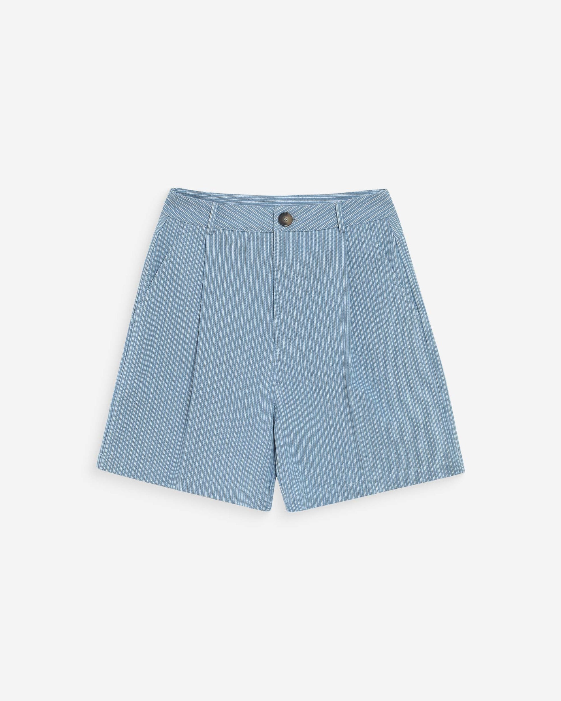 gestreifte Denimshorts - gerader, weiter Schnitt - hoher Bund - Gürtelschlaufen -Reißverschluss vorne mit G&M-Knopf in Hornoptik - italienische Vordertaschen - angedeutete Gesäßtaschen - Bundfalten vorne